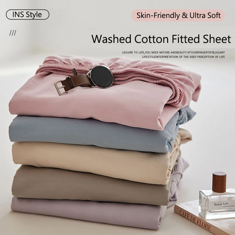Get the bed of your dreams with our Washed Cotton Fitted Sheet. This all-purpose sheet is breathable, quiet, and extremely comfortable all year long! Its deep elastic band delivers an adjustable, non-slip fit at a variety of mattress depths (100/160/200) and will fit securely on your Single, Double, Queen, or King size mattress. Made from gentle, skin-friendly cotton, its a simple, dependable foundation for your bed and will serve you with a consistently smooth and peaceful night’s sleep.